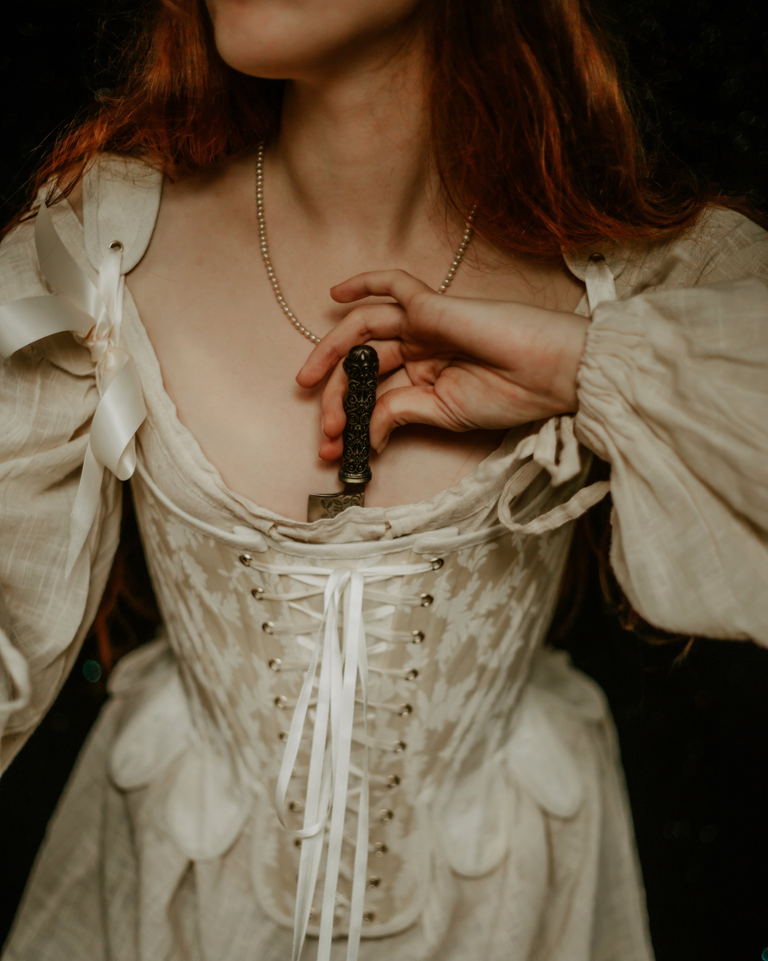 Experience the enchantment of the Lady of the Woods. Intricate floral motifs adorn her captivating garment, the white brocade corset. Immerse yourself in its captivating beauty as nature and couture converge in a mesmerizing visual symphony.