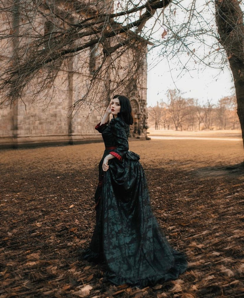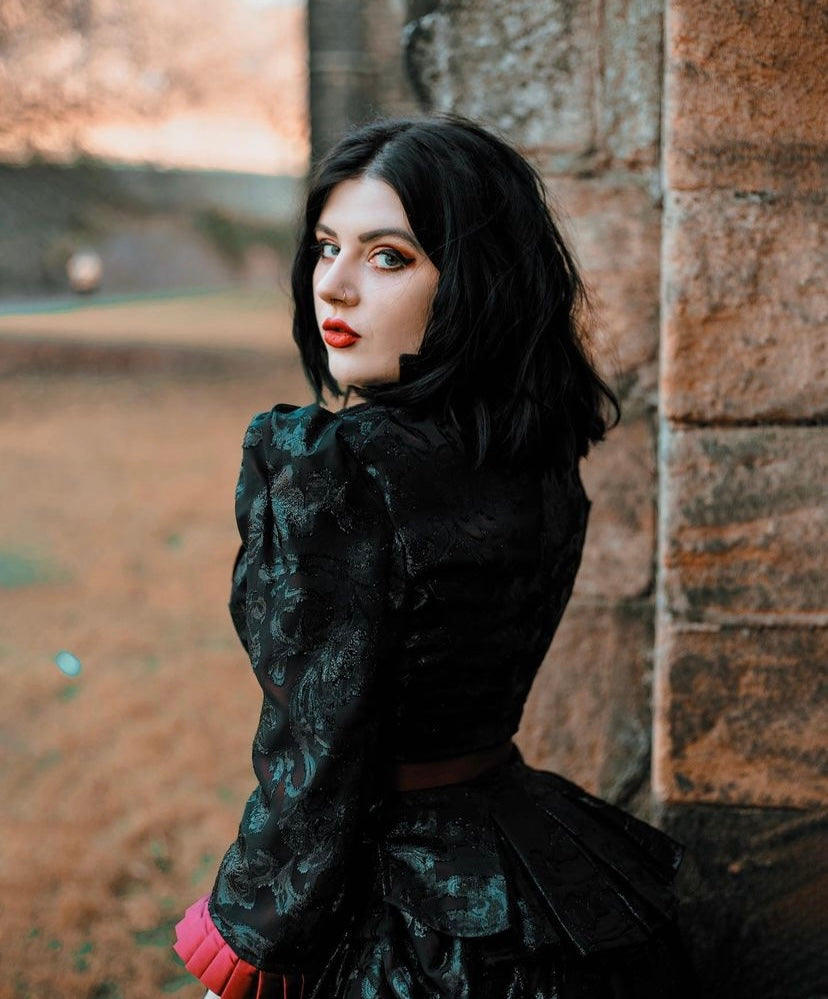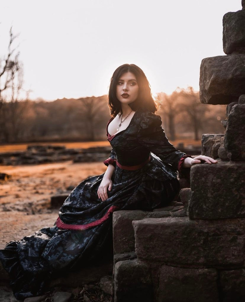 Introducing the "Lunar Requiem" Vampire Dress: a mesmerizing blend of elegance and sustainability. Crafted entirely from recycled materials, this historically inspired gown showcases a midnight black silhouette adorned with blood red details. Embrace your inner nocturnal enchantress and make a lasting impression with this eco-conscious masterpiece.